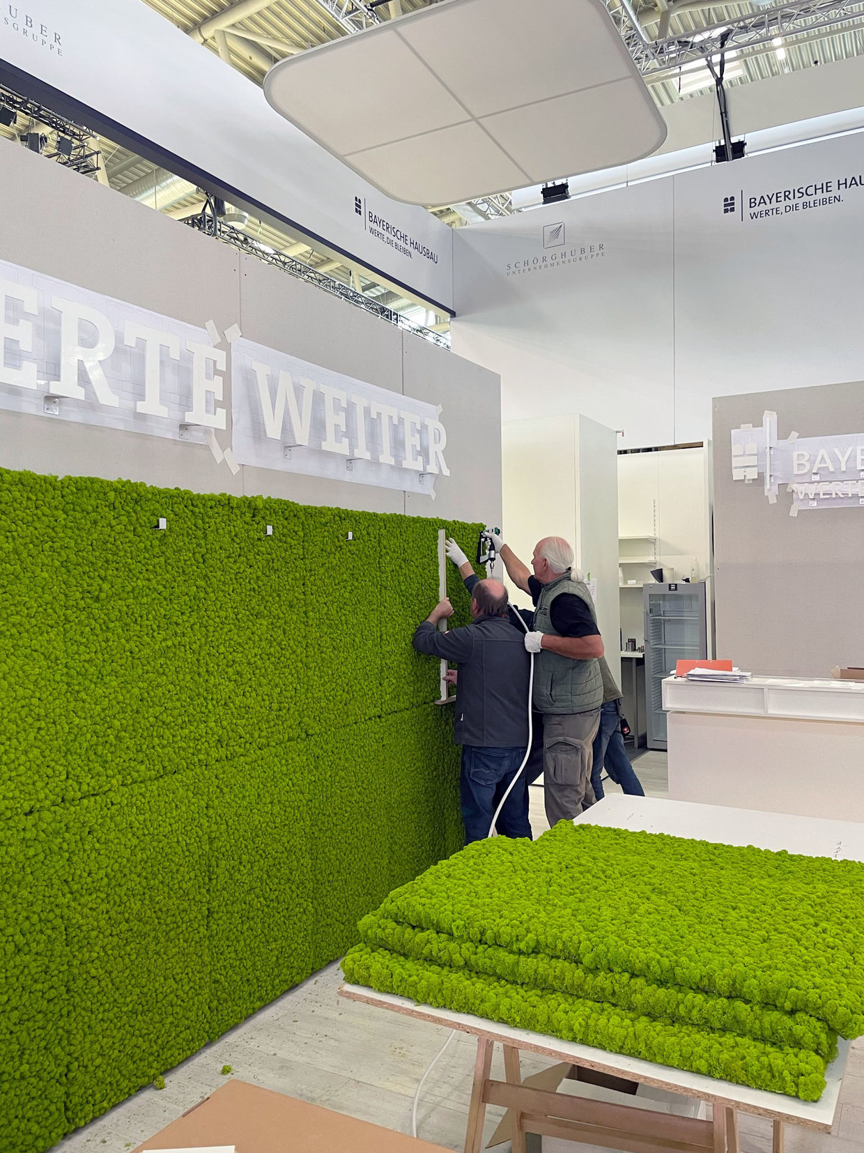 - Kennzeichnung und Dokumentation: Die Materialien sollten klar und eindeutig als schwerentflammbar gekennzeichnet sein. Darüber hinaus ist es wichtig, dass die entsprechenden Zertifikate und Testberichte für die Materialien verfügbar sind und auf Anfrage vom Aussteller oder Messebauunternehmen vorgelegt werden können. Daher müssen Messebauunternehmen die Verwendung spezieller Materialien wie beispielsweise Mooswände für den Innenbereich auch im Vorfeld von der Messegesellschaft genehmigen lassen, indem sie die entsprechenden Zertifikate vorlegen. Des Weiteren müssen während des Aufbaus alle auf Gültigkeit geprüften Brandschutzzertifikate mitgeführt werden und ggfs. bei der Begehung durch die Feuerwehr vorgezeigt werden. Da die Zertifikate nur eine limitierte Gültigkeit haben, müssen für alte wiederverwendete Bauteile mitunter aktuelle Zertifikate der Hersteller nachgefordert werden.